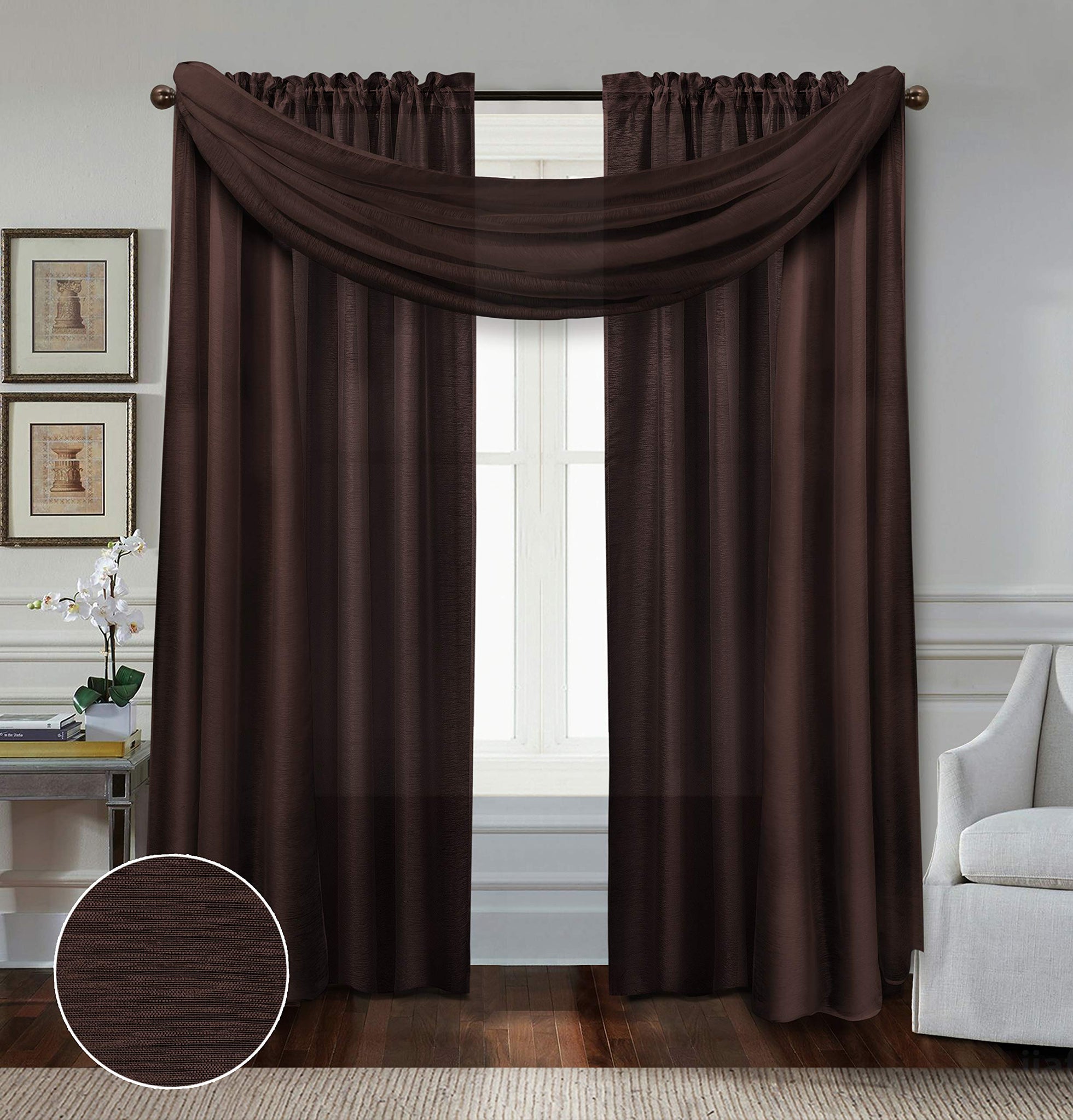 Details: Enhance your interior design with lightweight Doli sheers from the All American Collection. Each package contains two curtain panels and 1 scarf. The sheer fabric filters natural daylight through your windows while adding rich color that doesn't get washed out. The 1-inch rod pocket offers classic, carefree styling and easy installation - just hang and go!